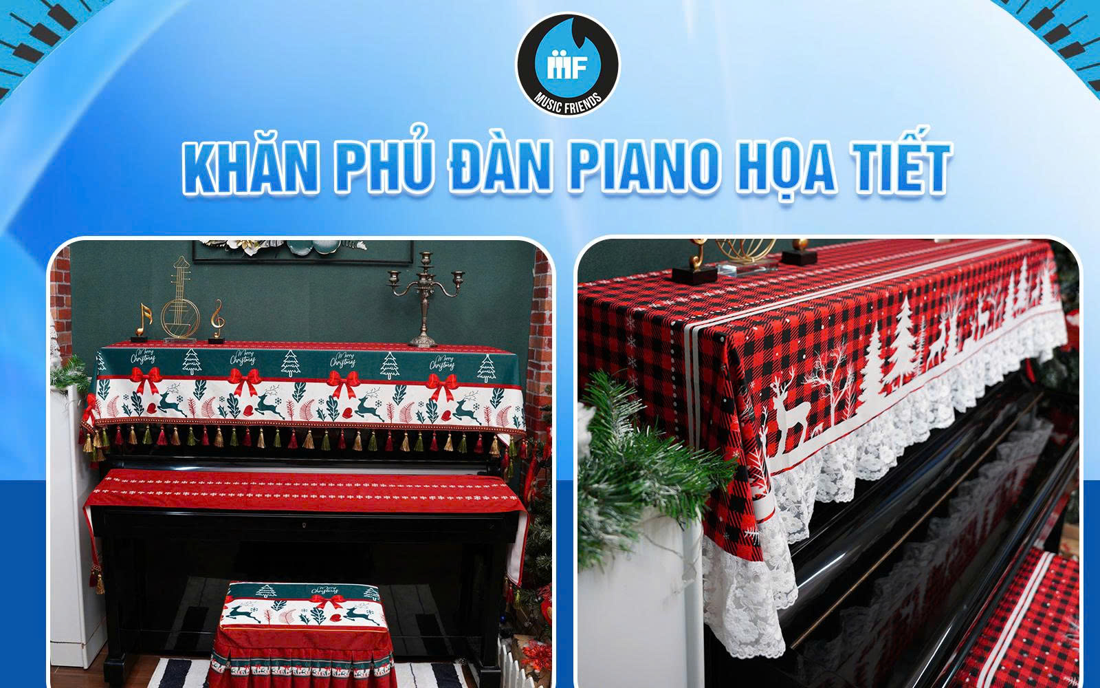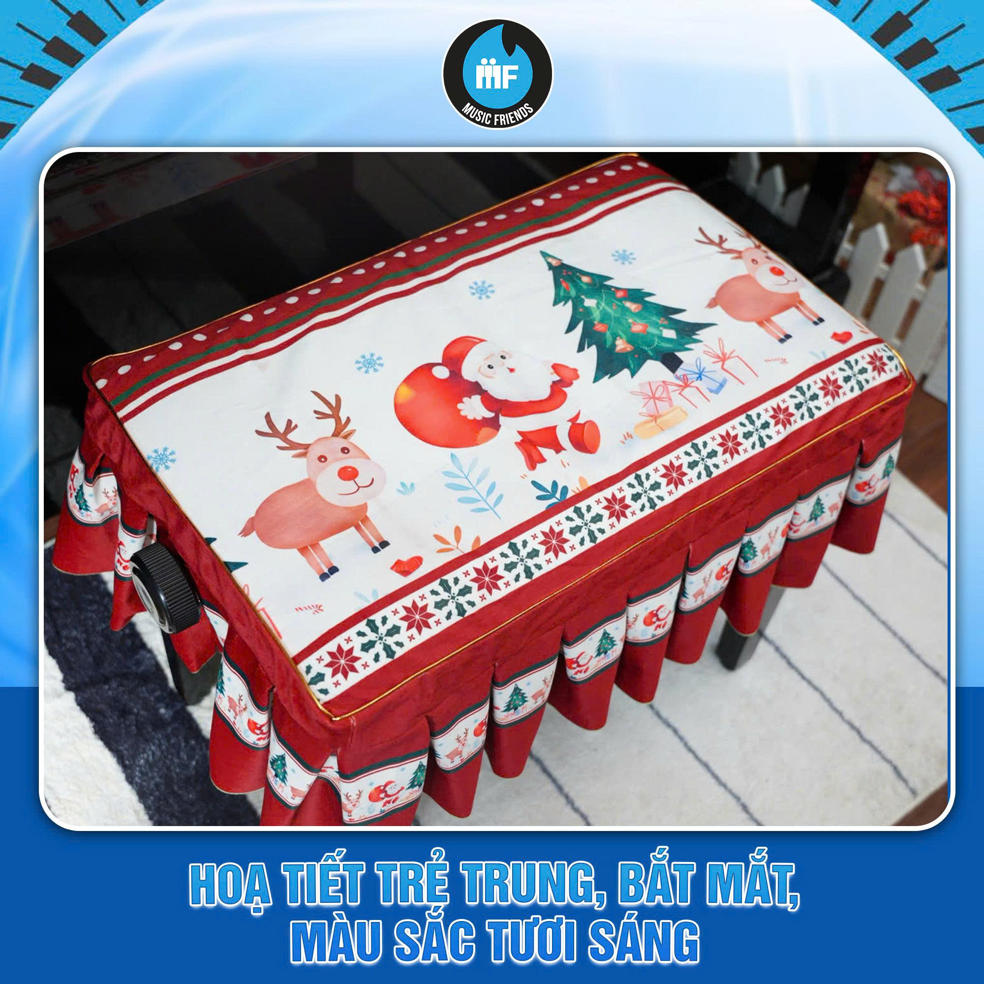 Đặc biệt, trong mùa lễ hội, nhiều mẫu khăn phủ đàn còn mang chủ đề Giáng Sinh như cây thông, hoa tuyết, hay sắc đỏ – xanh truyền thống. Chúng không chỉ làm đẹp cho đàn mà còn giúp không gian phòng khách hoặc phòng nhạc trở nên rực rỡ, ấm áp, tràn đầy cảm xúc.
