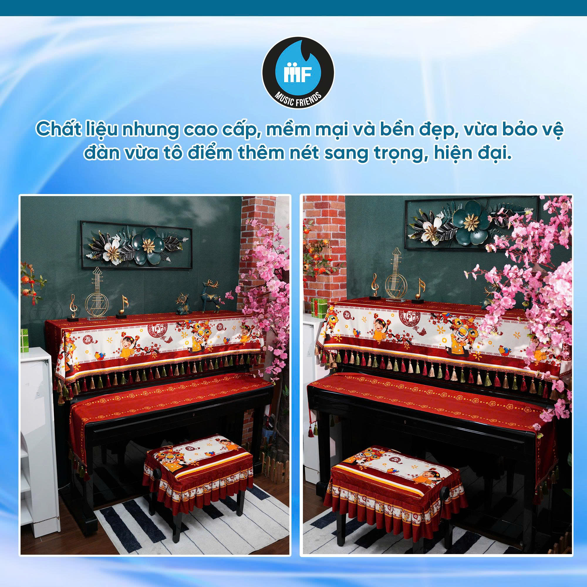 Trong dịp Tết, việc chọn khăn phủ đàn với chất nhung vừa giúp bảo vệ đàn khỏi bụi, hơi ẩm, xước bề mặt, vừa mang tới cảm giác sang trọng, hiện đại — phù hợp với ý nghĩa “đổi mới” đầu năm.