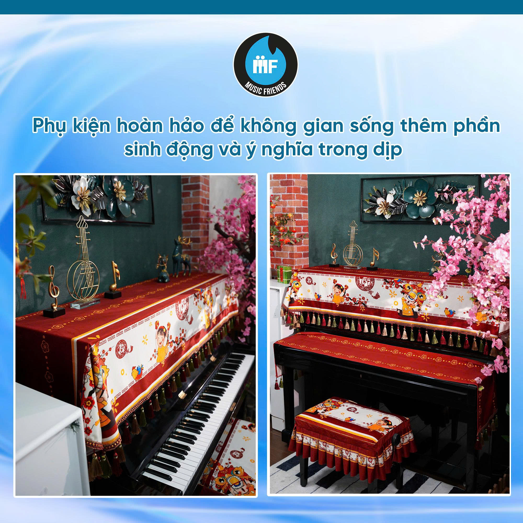 Khi Tết đến, không chỉ là thời điểm kết nối sum họp mà còn là dịp để mỗi không gian sống được “làm mới” với những điểm nhấn nhẹ nhàng nhưng tinh tế. Một chiếc khăn phủ đàn piano là phụ kiện hoàn hảo để mang nét xuân rộn rã vào góc âm nhạc của gia đình. Với hoạ tiết nhẹ nhàng, tượng trưng cho sự may mắn và khởi đầu mới, khăn phủ đàn giúp cây piano của bạn trở nên duyên dáng, tươi trẻ hơn — phù hợp cho không khí Tết ấm áp và trang trọng.